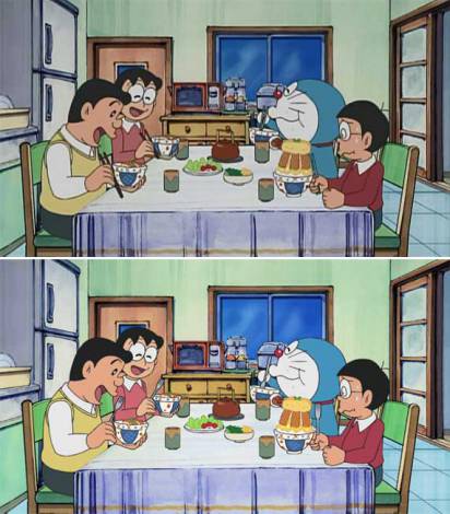 画面上の編集も行われた。例えばオムライス(オムレツと米)はパンケーキに、箸はフォークに変えられた。