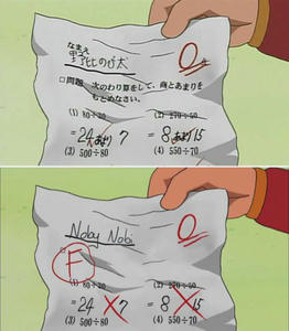 日本円はUSドルに。テストでの日本のチェックマークは×マークに置き換えられた。そして0点であることを分かりやすくするため、Fの字が追加された。