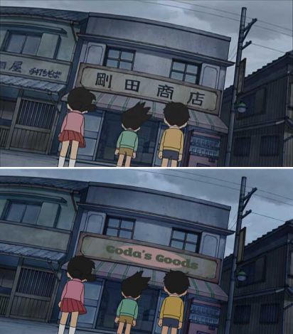 日本の看板、例えば「剛田商店」は"Goda's Shop"となった。「ドラエモンの100年タイムカプセル」ではカプセルに入れる中身が変わっている。